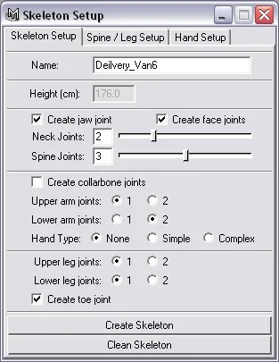 Creates a skeleton based upon preset options. Records the height of newly created skeleton and ability to position arms, legs and other joints before accepting skeleton. Extra tabs to create rigs for complex hands, legs, and spines.